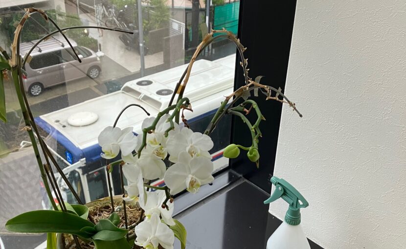 2022年のフォト研「凛の会」宛てに送ったミニ胡蝶蘭が今年新しく芽をつけて開花しました。