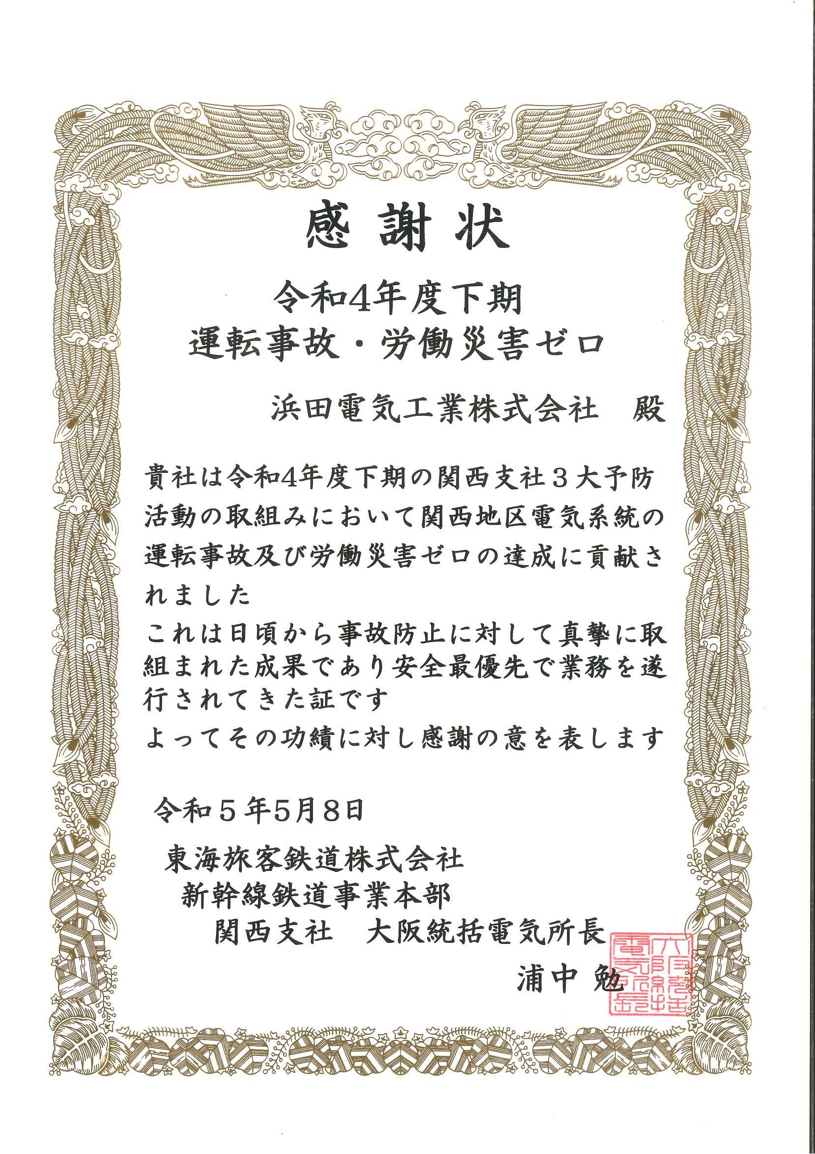 令和4年下期 運転事故・労働災害ゼロの達成に関する感謝状 2023.05.9 表彰状・感謝状 2023年5月8日(月)東海旅客鉄道株式会社 新幹線鉄道事業本部 関西支社 大阪統括電気所長様より感謝状を頂きました。 表彰状・感謝状 入社式(2023)前の記事 ちゃちゃちゃ次の記事