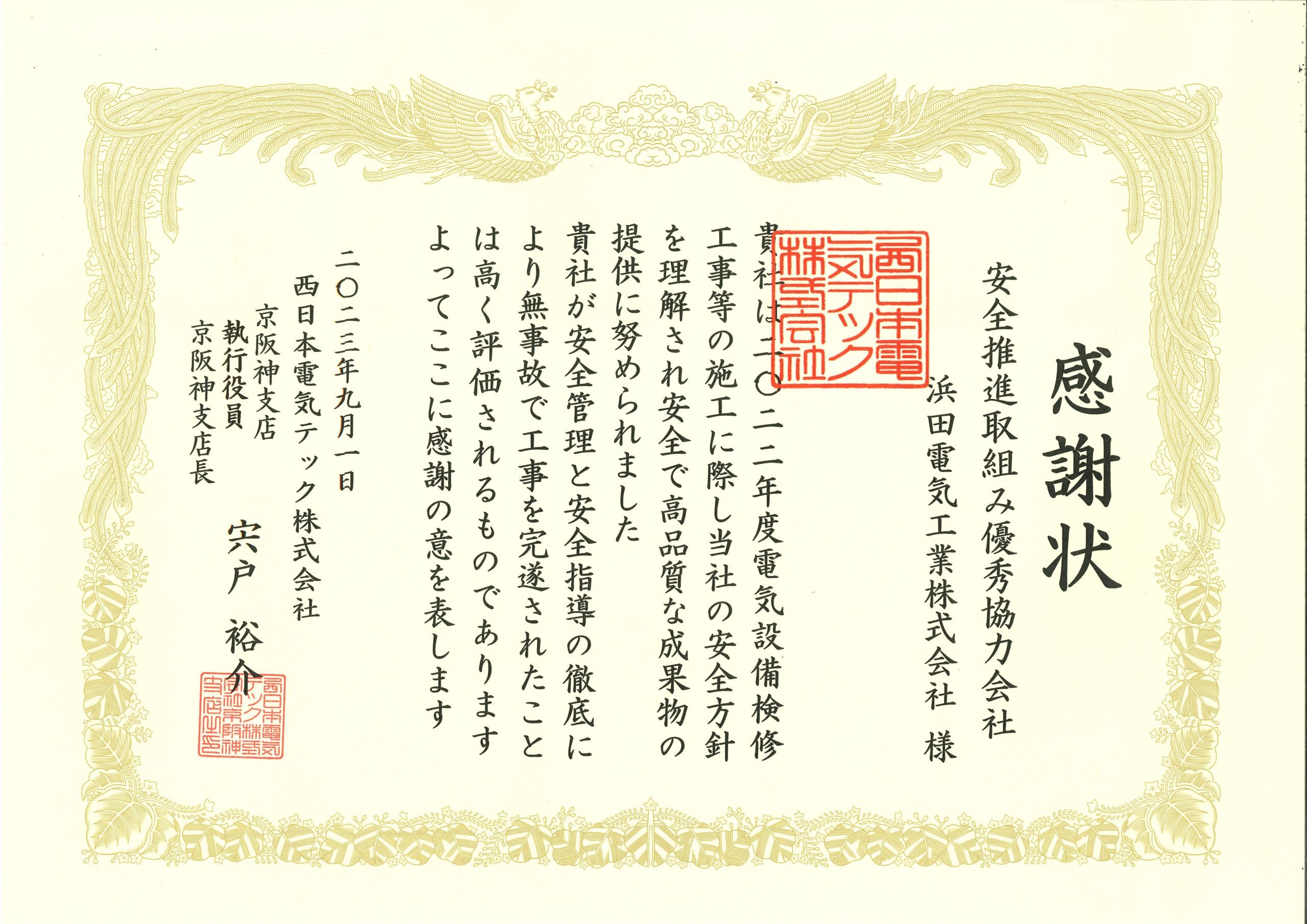 • 安全管理と安全指導に対する感謝状(西日本電気テック株式会社)